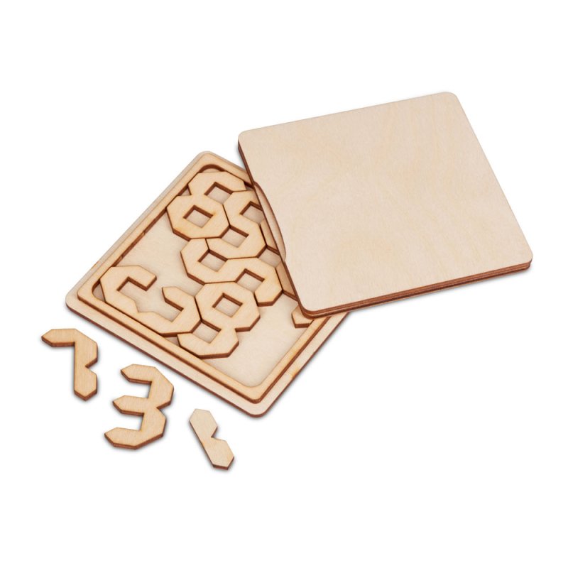 Деревянная головоломка Цифры - прекрасный способ занять себя в дороге. Корпус изготовлен из берёзовой фанеры и используется как игровое поле, не занимая много места в сумке.