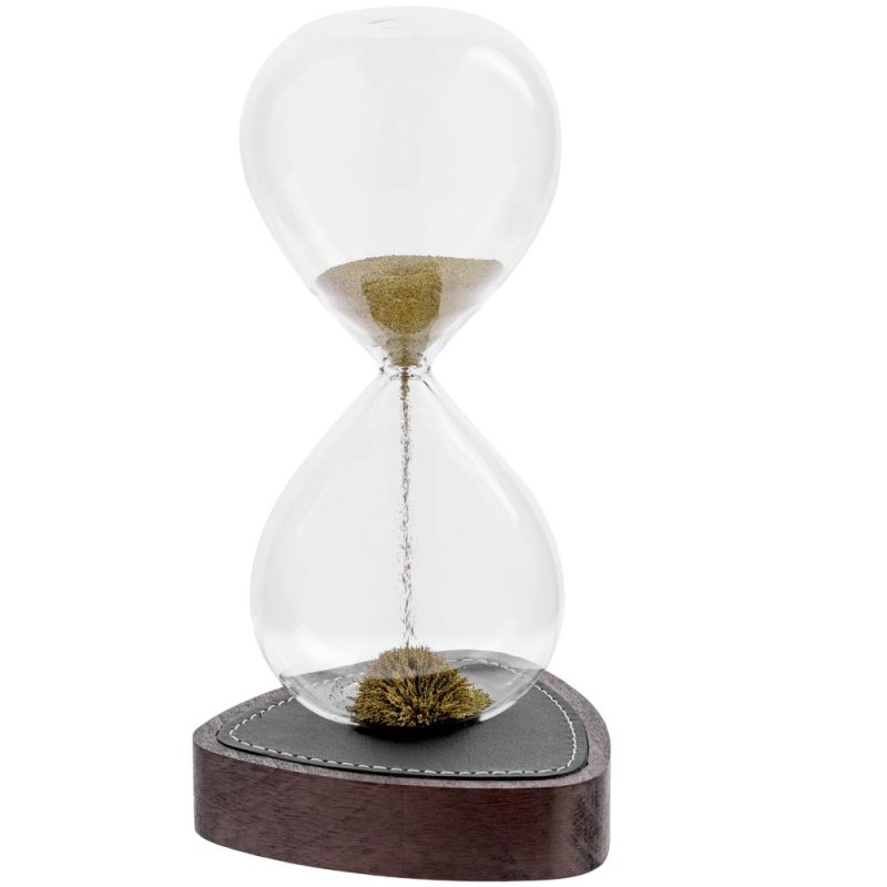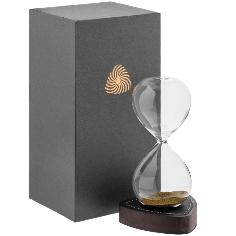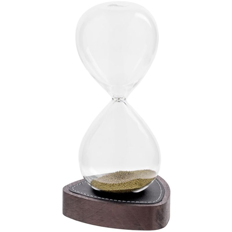 В набор входит колба с магнитным песком золотистого цвета на +/- 60 секунд и деревянная подставка из бука со вставкой из натуральной кожи.