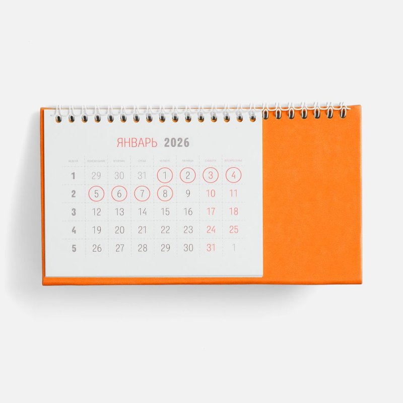 Настольный, перекидной календарь-«домик» выполнен из материала Latte, оранжевый ОО.