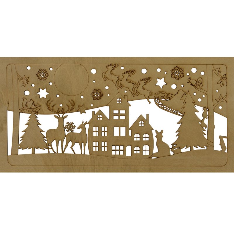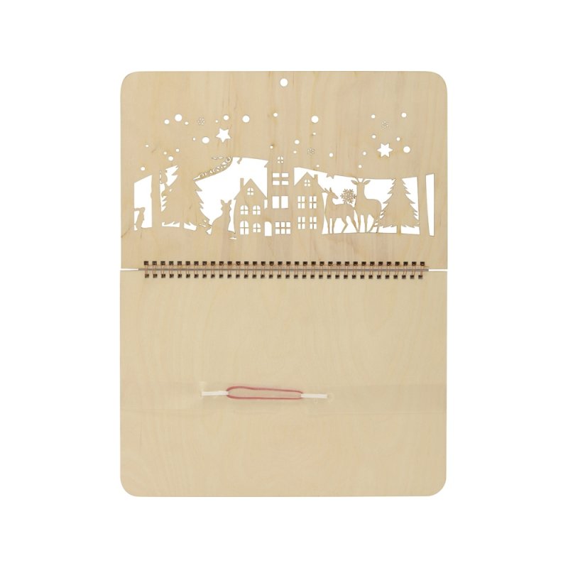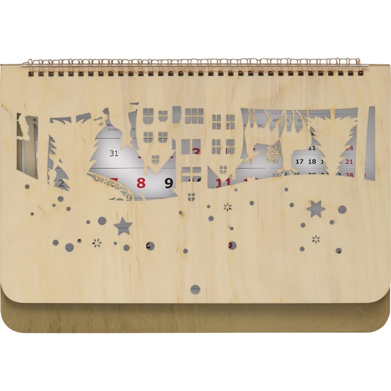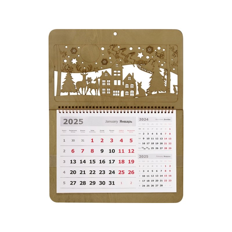 Настенный перекидной календарь имеет необычную обложку, в роли которой выступают фанерные крышки. Нижняя крышка сплошная, верхняя — резная, ажурная, с вырезанным новогодним пейзажем и большим полем под нанесение логотипа или надписи, которая органично впишется в облик календаря.