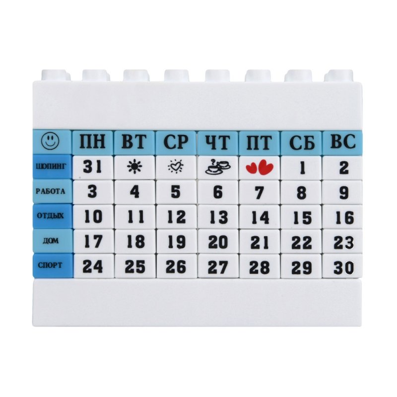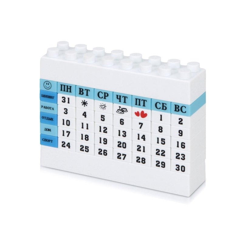 Замечательная и креативная идея для активных и целеустремленных людей. Вечный календарь в виде конструктора подчеркнет индивидуальность обладателя и поможет держать ритм жизни под контролем. Календарь поможет в планировании рабочего и свободного времени, ведь кубики можно собирать так, как вы того хотите, учитывая ваши планы и приоритеты.