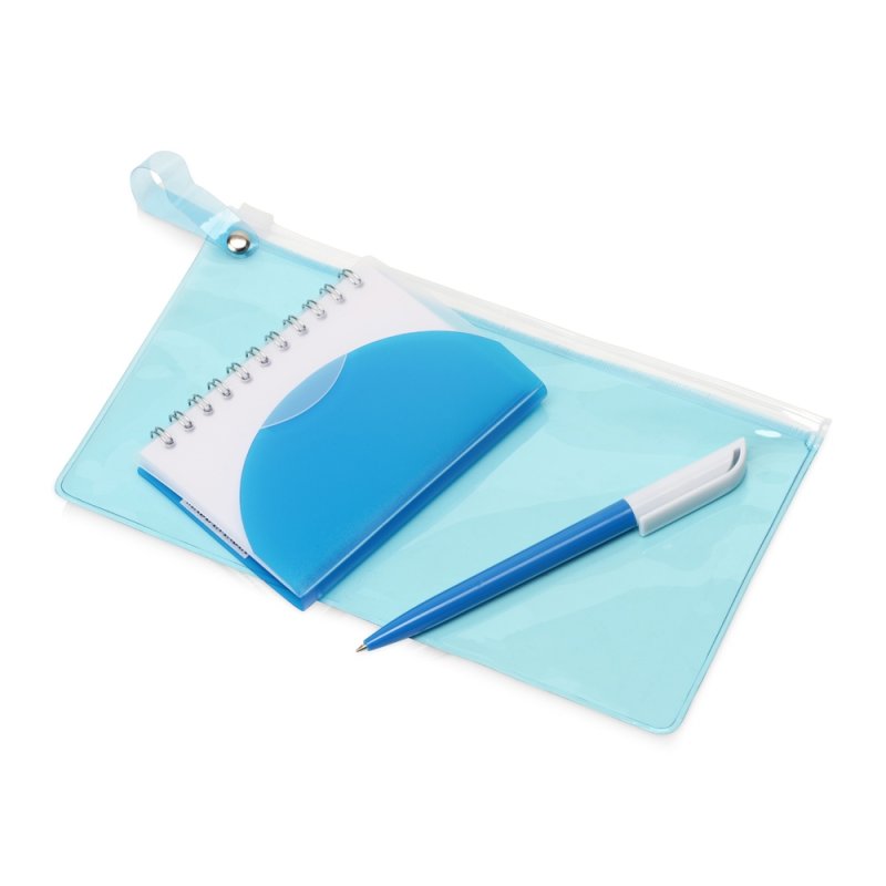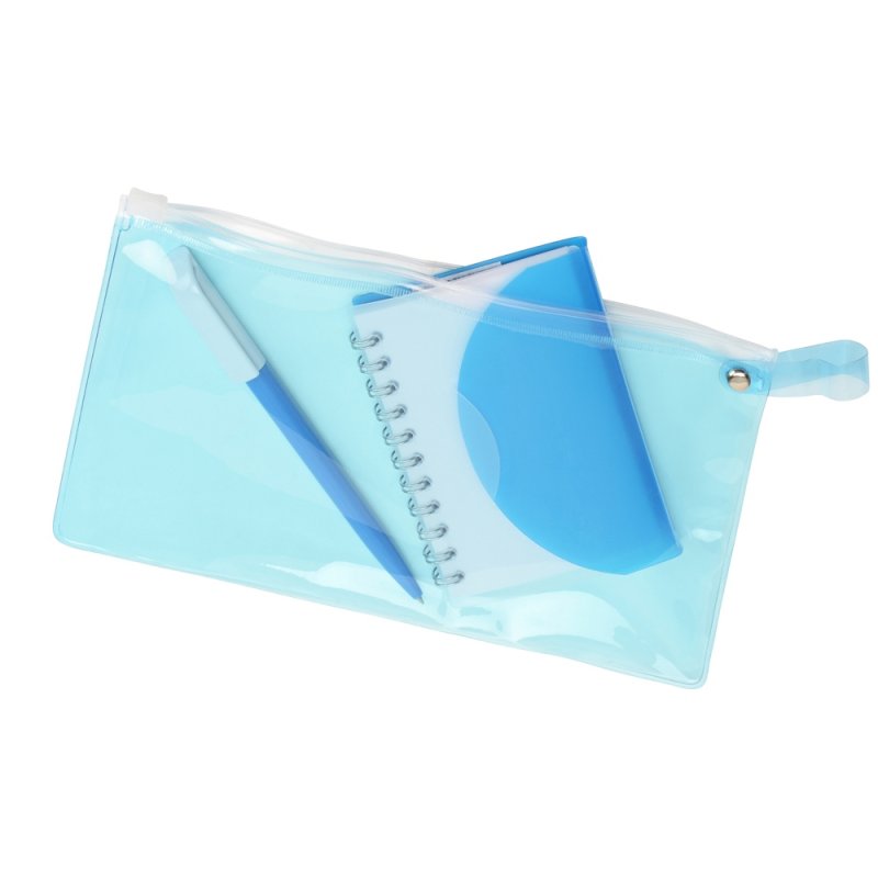 - Цвет товара:блокнот- прозрачный/голубой, ручка- голубой/белый, пенал- голубой прозрачный