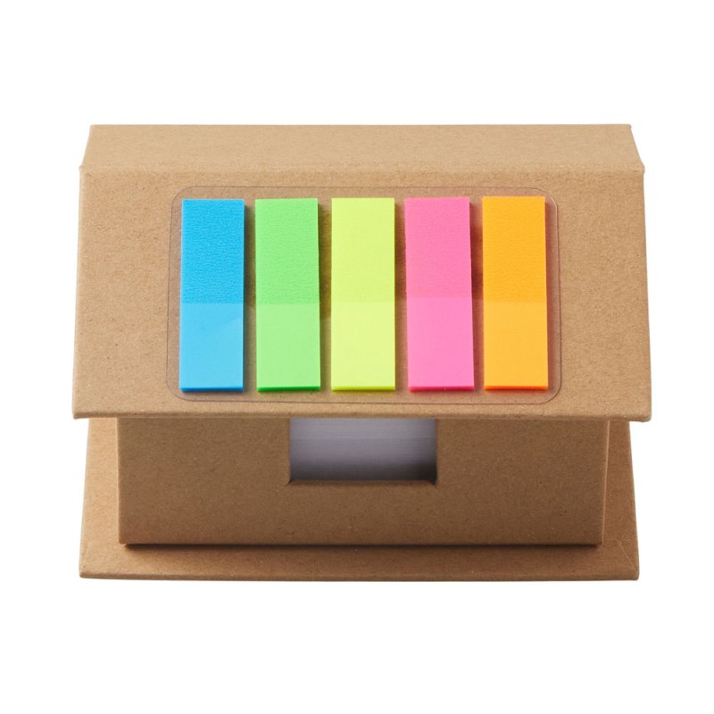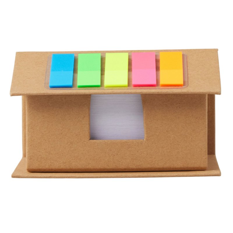 Набор стикеров и бумаг для записи в виде домика. На крыше домика расположены стикеры, 5 цветов по 25 штук каждого цвета. Внутри домика - 400 листов белой бумаги для записей плотностью 70 г/м2.