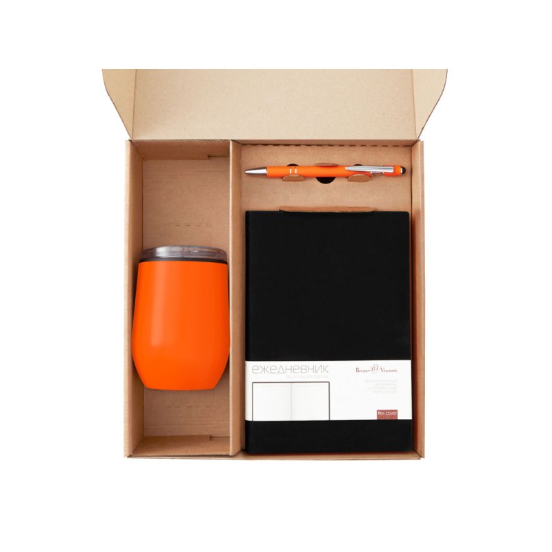 - Материал товара:ежедневник - искусственная кожа, термокружка - нержавеющая сталь снаружи, полипропилен внутри, ручка - металл c покрытием soft-touch, ситечко - нержавеющая cталь