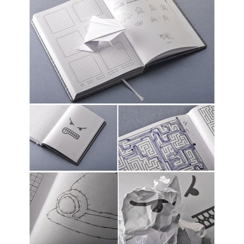 Суровая обложка в стиле industrial скрывает страницы весьма нестандартного блокнота-ежедневника. Внутри — страницы, разлинованные всеми возможными способами; чистые листы и классический набор «бумажных» игр: от морского боя до судоку, а также «листы гнева».