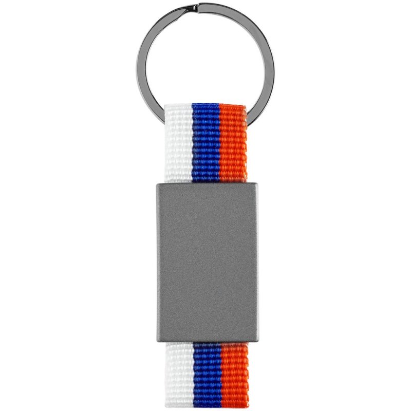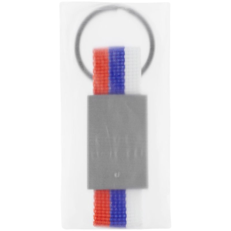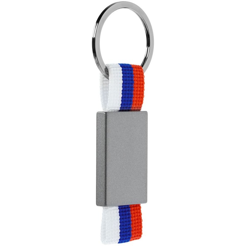 Металлический брелок с графитовым покрытием и тканью в виде триколора.
