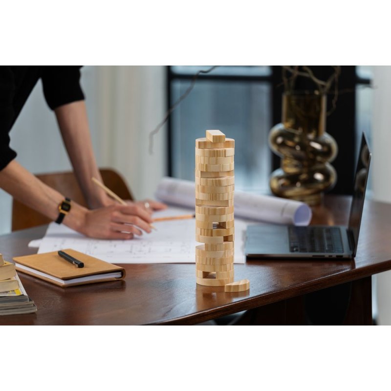 Правила игры просты: сначала строится башня — по три брусочка в ряд, каждый слой перпендикулярен предыдущему. Затем игроки по очереди вытаскивают по одному брусочку и кладут его на верх сооружения. Тот игрок, кто обрушит башню, проиграл. Игра тренирует ловкость, внимание, терпение и пространственное мышление, что очень важно и в бизнесе. Так что подарок не только развлечет, но и может стать символом-пожеланием.