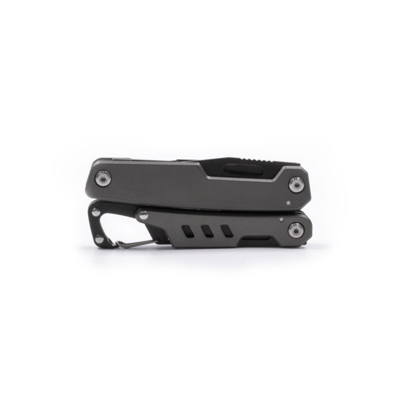 Многофункциональный инструмент 11-в-1 в компактном корпусе из закалённой нержавеющей стали. Включает: плоскогубцы и острогубцы, кусачки, инструмент для зачистки кабеля, нож с фиксатором лезвия, пила по дереву с фиксатором лезвия, крестовая и плоская отвёртки, открывалка для бутылок, консервный нож, карабин. Поставляется с чехлом для крепления на поясе.
