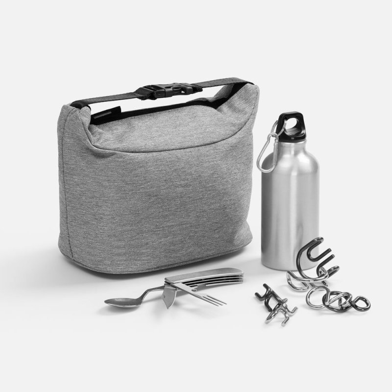 - Материал:термосумка - полиэстер, 600D, переработанный; столовый прибор - нержавеющая сталь; бутылка - алюминий; головоломки - металл, нержавеющая сталь; мешочек - хлопок