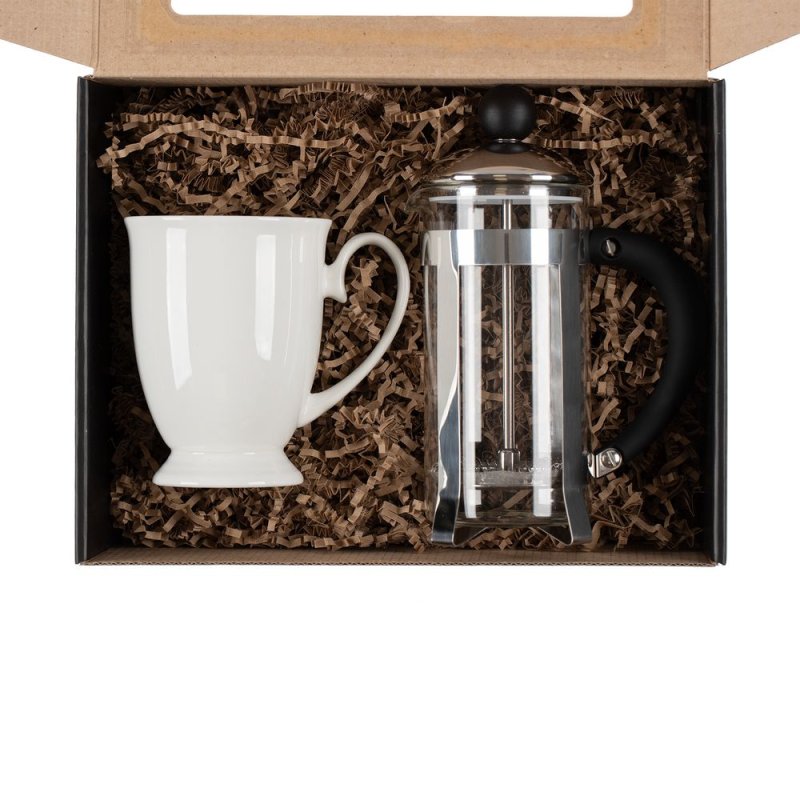 - Размеры:френч-пресс: высота 19 см, диаметр 7 см, ширина с ручкой 11,5 см; кружка: диаметр сверху 8,5 см; высота 10,8 см; дно 6 см; коробка: 25,9х19,7х9 см