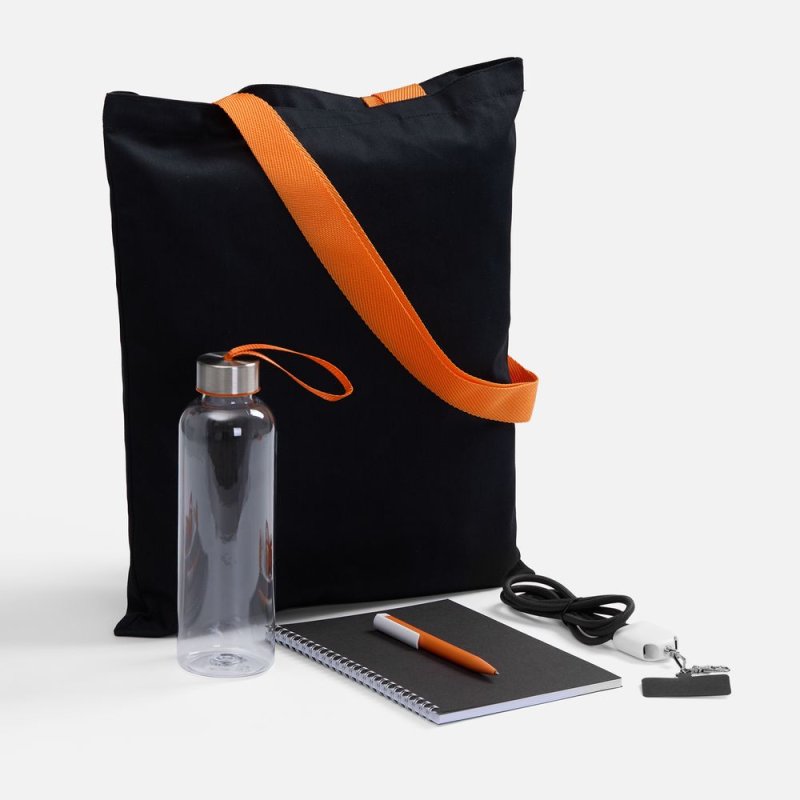 - Материал:сумка - хлопок, 240 г/м²; ручки - полиэстер; кабель-ланьярд - нейлон, пластик; металл; бутылка - пластик, пищевой; крышка - металл, пластик; блокнот - бумага, картон; ручка - пластик