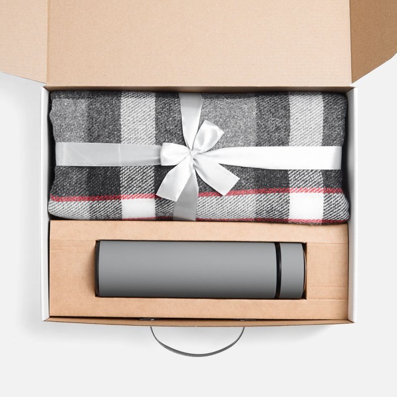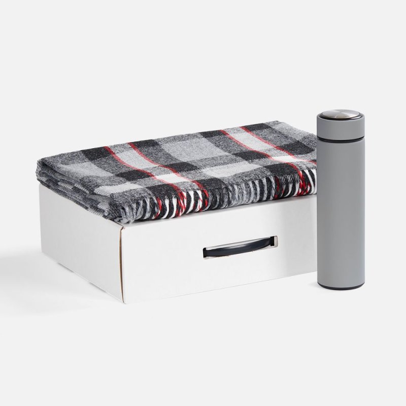 - Материал:плед - шерсть, 15%; хлопок, 5%; полиэстер 60%; акрил, 20%, плотность 200 г/м²; термос - нержавеющая сталь, 304; покрытие софт-тач; коробка - картон