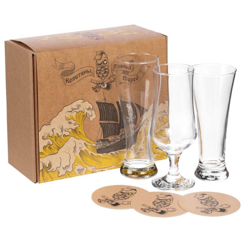 Три бокала разных форм, чтобы максимально раскрыть особенности выбранных сортов пива, костеры с брутальным принтом — свистать всех наверх и пусть пива будет целое море!