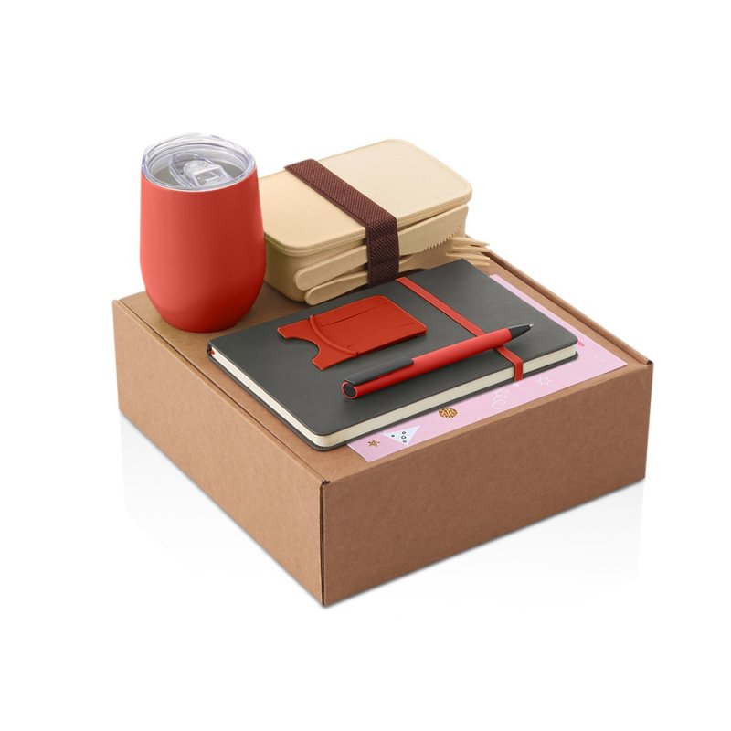 - Материал товара:картхолдер - силикон, термокружка - нержавеющая сталь, блокнот - термо PU с зернистой структурой, ручка - пластик с покрытием soft-touch, ланчбокс - 50% пшеничное волокно, 50% ПП-пластик, открытка - бумага, коробка - картон