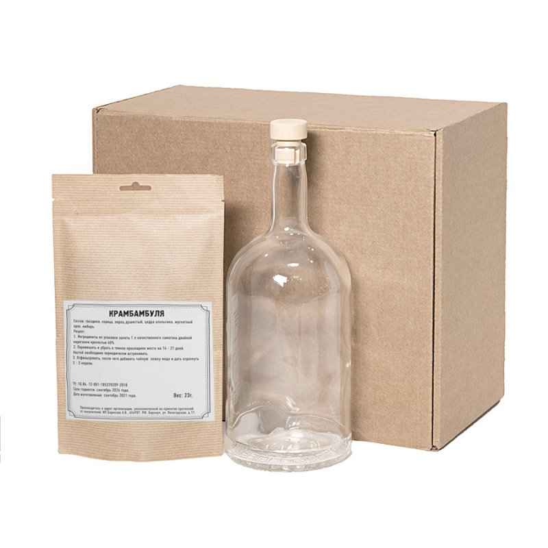 Набор для приготовления 1литра «Крамбамбули». В состав набора входят: - набор трав и специй " Крамбамбуля" (гвоздика, корица, перец душистый, цедра апельсина, мускатный орех, имбирь.),- бутылка 1 л,- пробка Т-образная, - стружка бумажная,-коробка подарочная арт. 34930,размер 30 х 25 х 15 см Настойка появилась в 18 веке в Великом княжестве Литовском на территории современной Беларуси. Считалась напитком знати, поскольку в то время завезенные с Индии специи были очень дорогими.