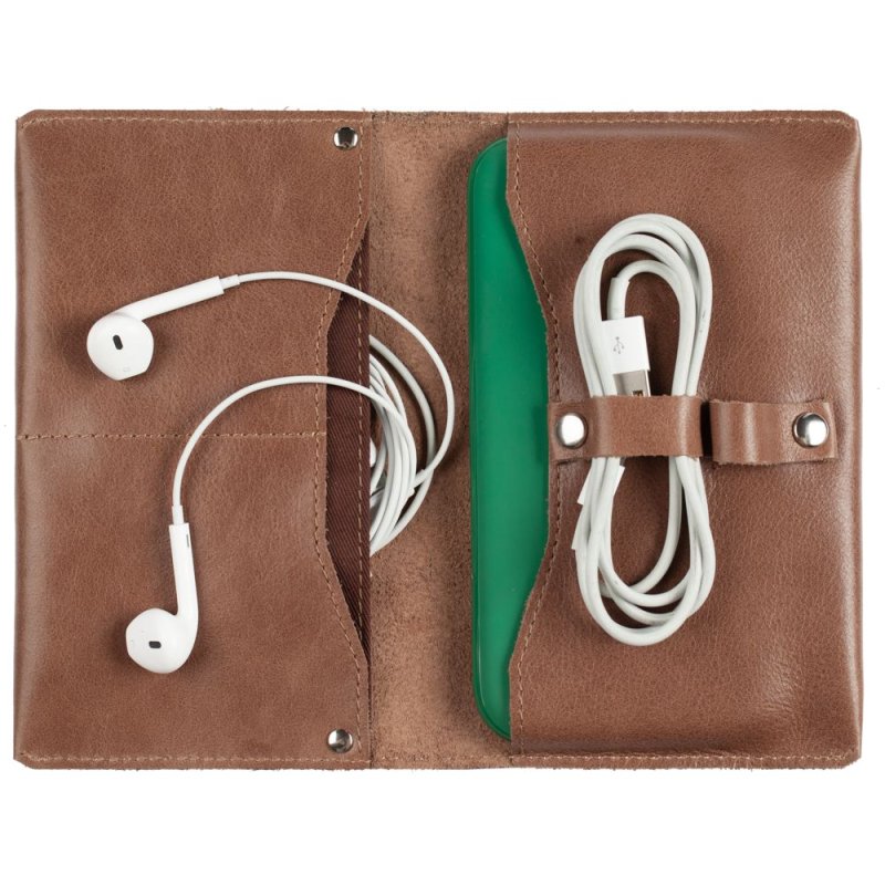 В органайзере есть два крепления на кнопке и четыре кармана разных размеров для проводов, наушников и зарядных устройств.