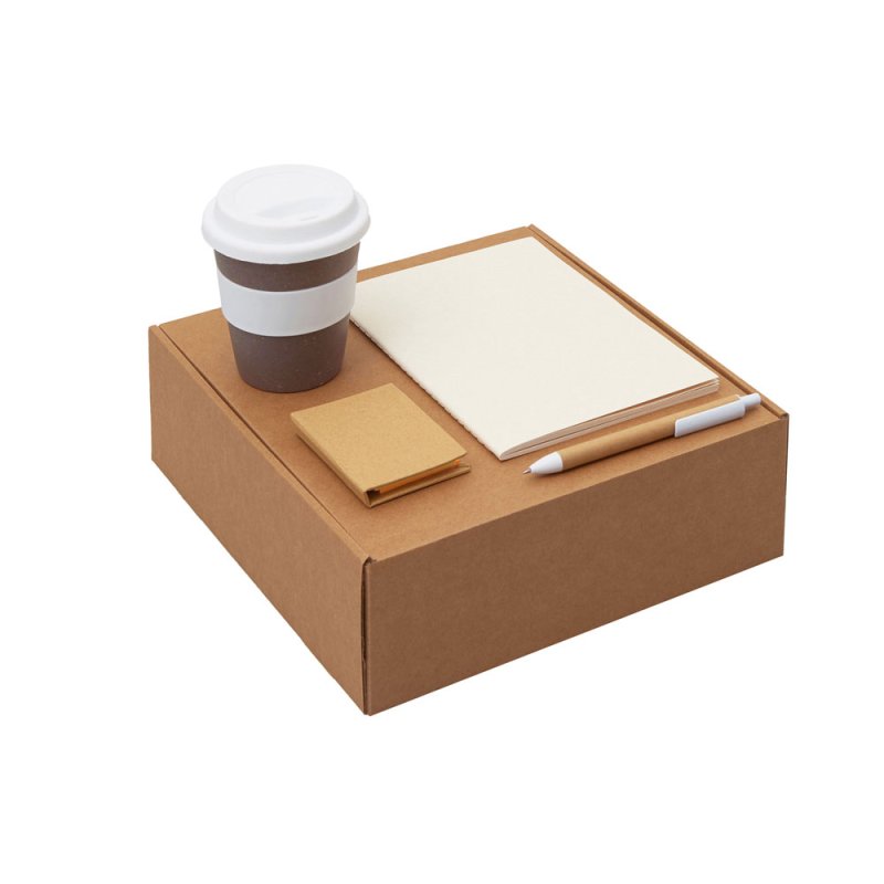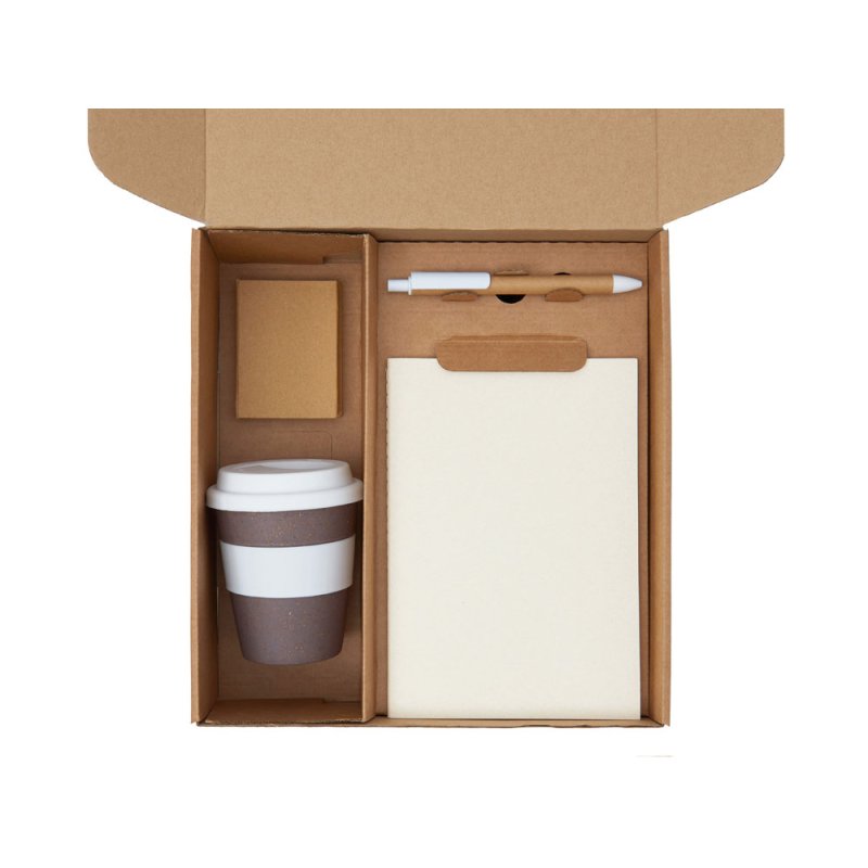 - Материал товара:блокнот- бумага из переработанных тетра-паков, ручка- картон, пластик, стакан- 50% бамбуковое волокно, 50% полипропилен, коробка- картон