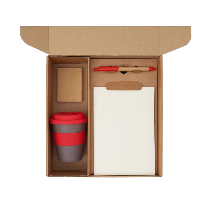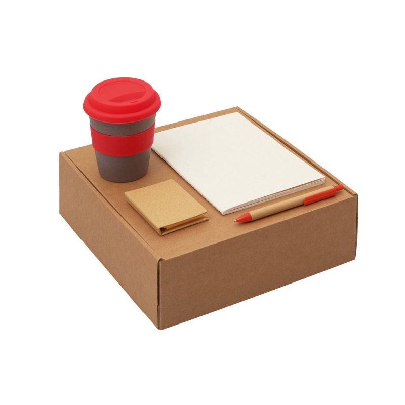- Материал товара:блокнот- бумага из переработанных тетра-паков, ручка- картон, пластик, стакан- 50% бамбуковое волокно, 50% полипропилен, коробка- картон