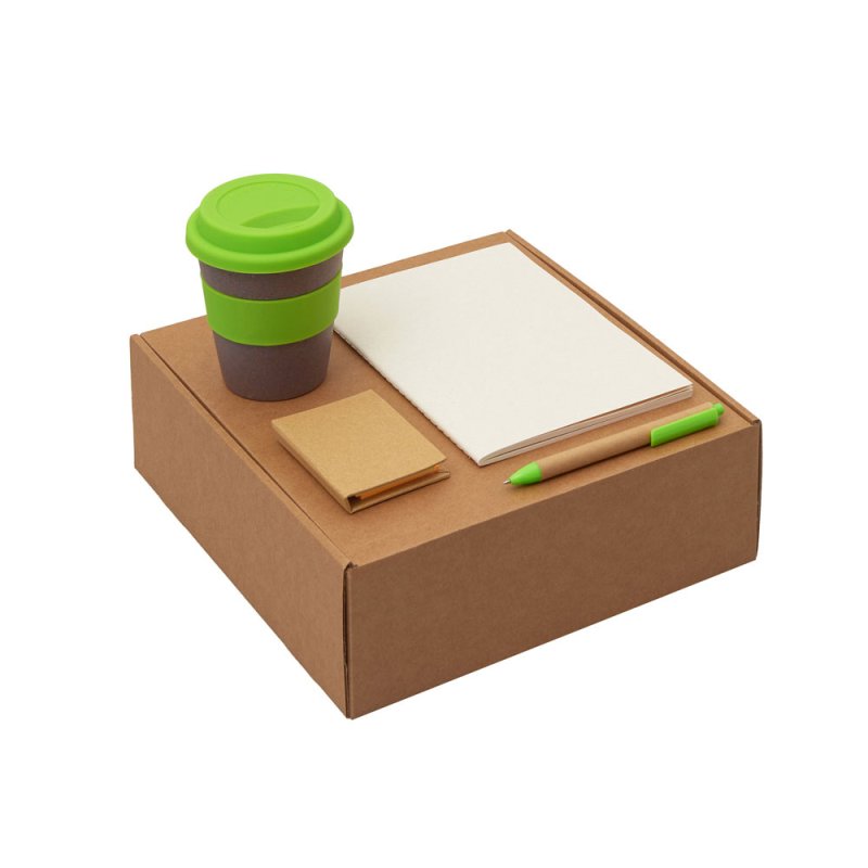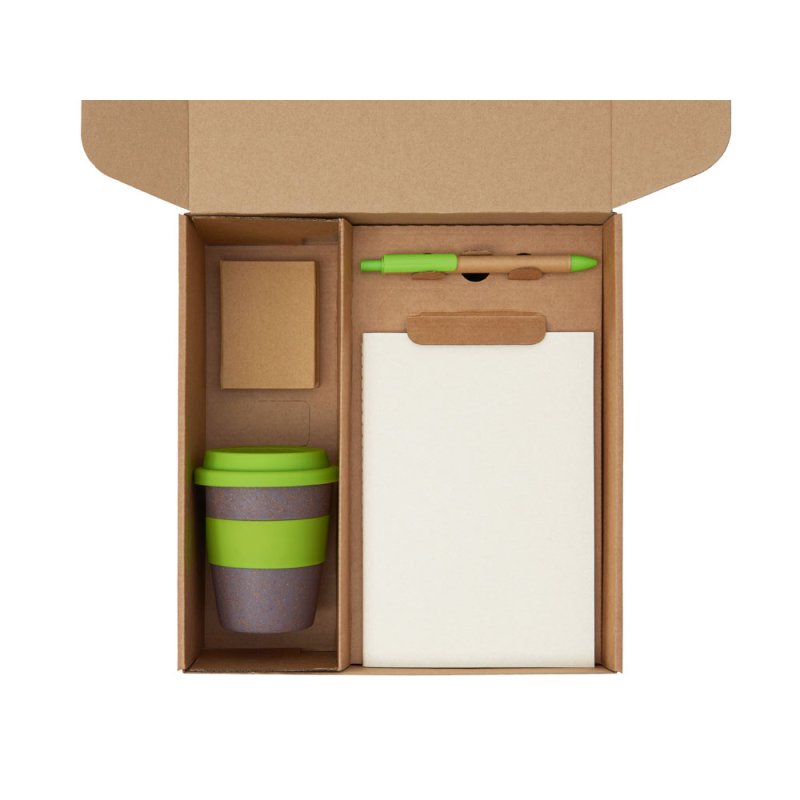 - Материал товара:блокнот- бумага из переработанных тетра-паков, ручка- картон, пластик, стакан- 50% бамбуковое волокно, 50% полипропилен, коробка- картон