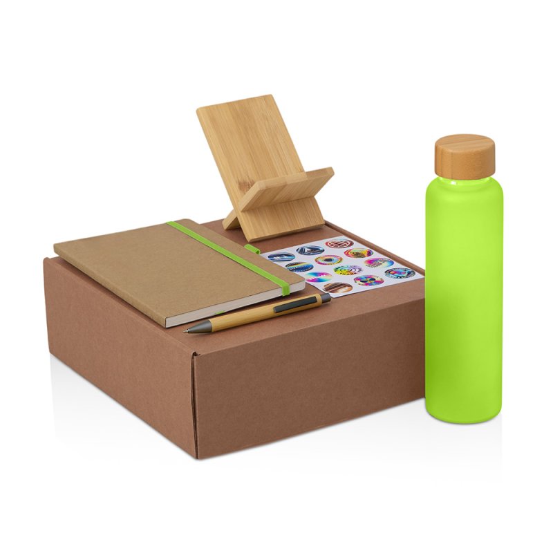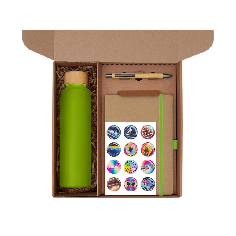 - Материал товара:бутылка - боросиликатное стекло, бамбук, блокнот - картон, бумага, ручка - бамбук, пластик, подставка - бамбук, наполнитель - бумага, стикеры - смола, коробка - картон