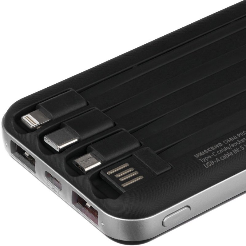 Обновленная модель популярной линейки Omni от бренда Uniscend теперь имеет поддержку Power Delivery и может быстро заряжать смартфон или ноутбук через встроенный кабель Type-C и разъемы USB-A и Type-C (с подходящим для быстрой зарядки проводом). Полный комплект встроенных проводов и цифровой индикатор заряда остались на месте.