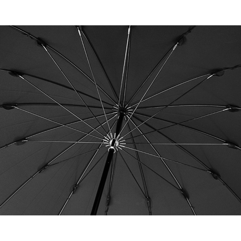 Солидный изысканный зонт с ручкой из дерева и 16 спицами. Большой купол легко укроет от дождя сразу двоих, а надежная конструкция выдержит даже сильный ветер.