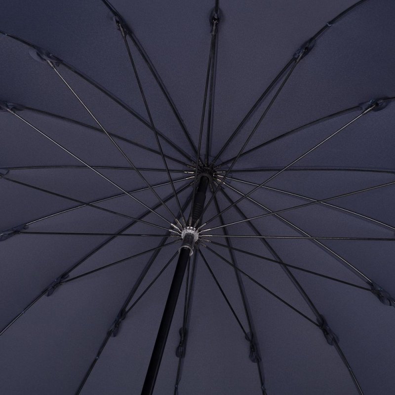 Солидный изысканный зонт с ручкой из дерева и 16 спицами. Большой купол легко укроет от дождя сразу двоих, а надежная конструкция выдержит даже сильный ветер.