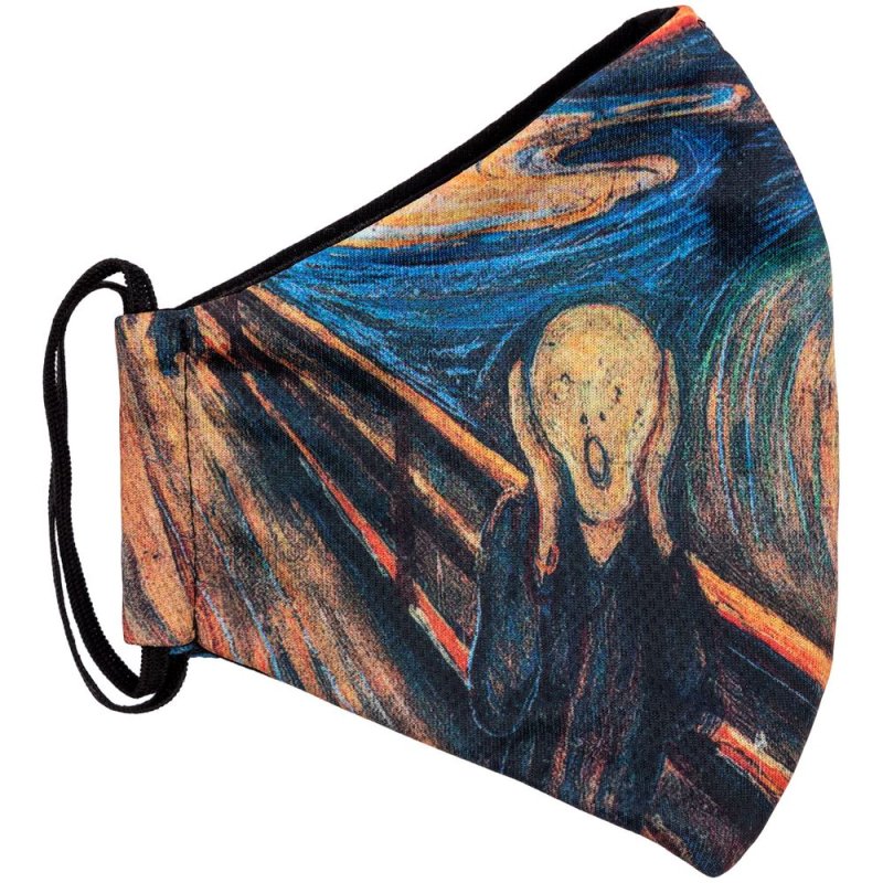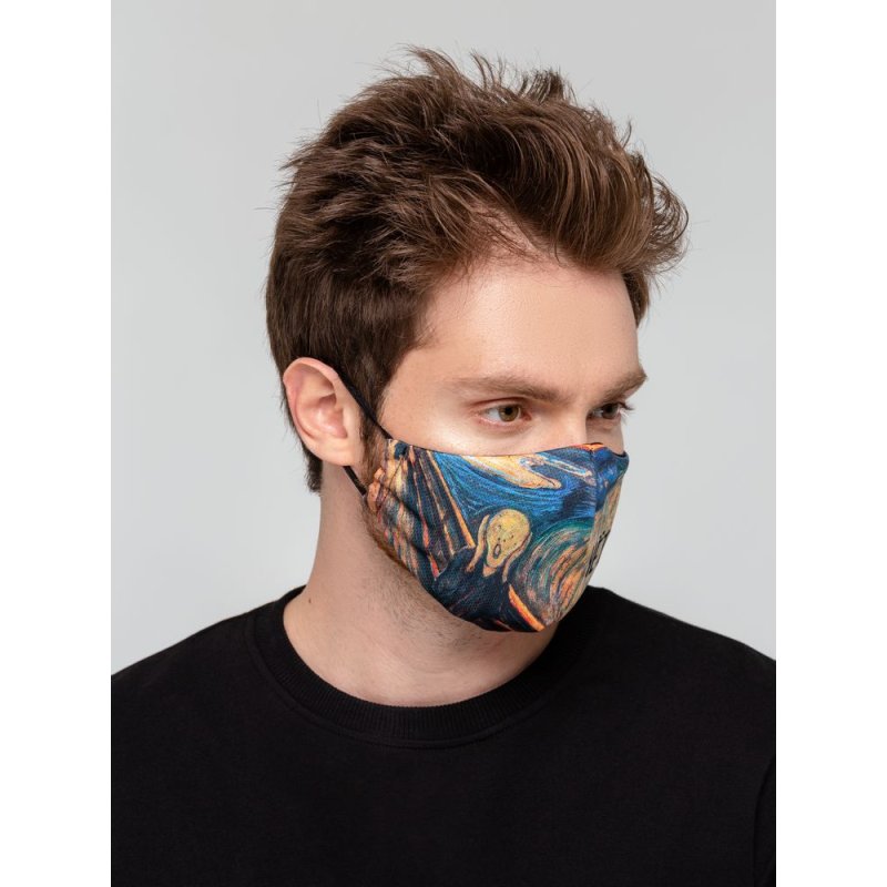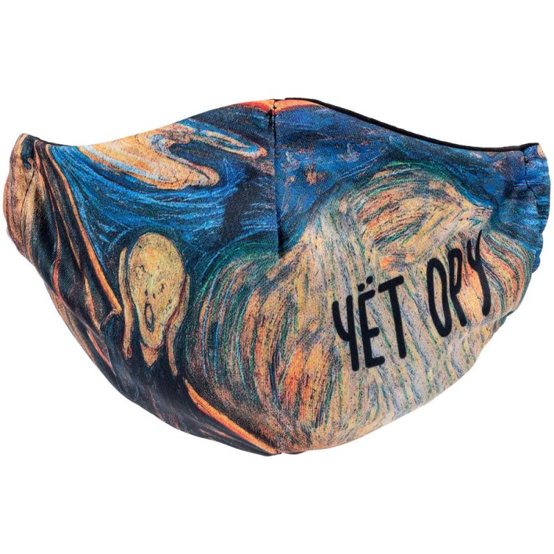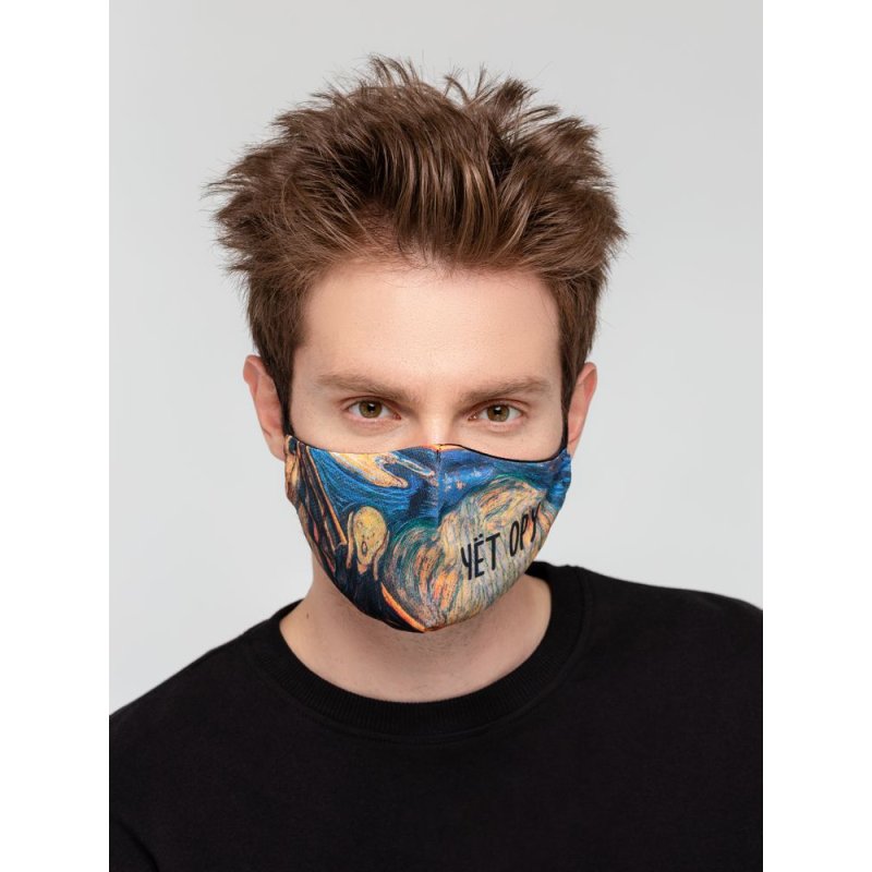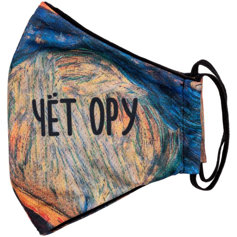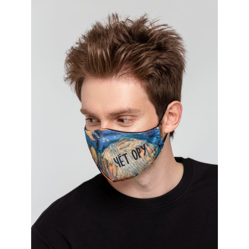 Многоразовая маска из дышащей ложной сетки с ярким принтом с гигиенической хлопковой подкладкой и заушниками-резинками.