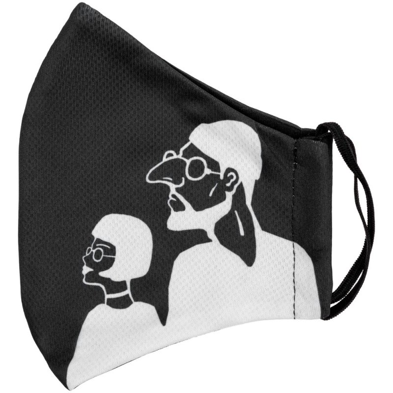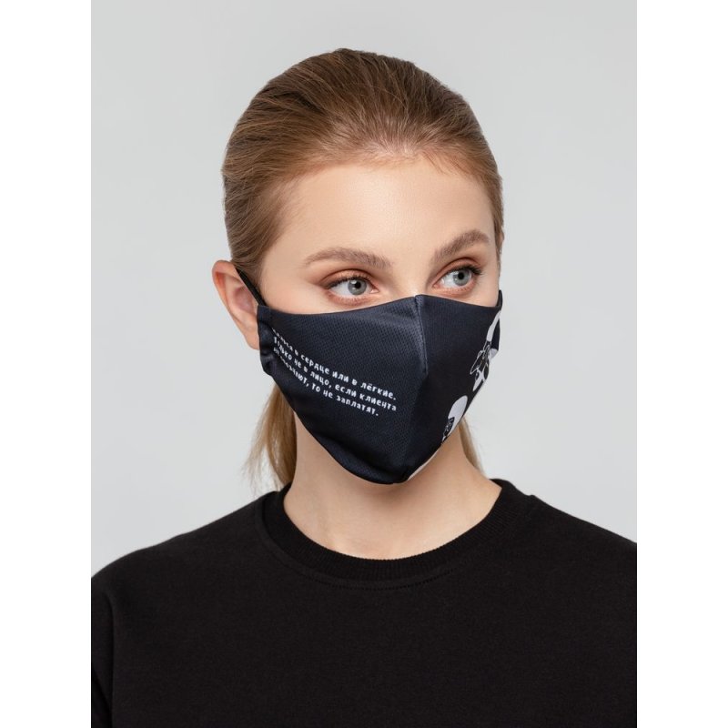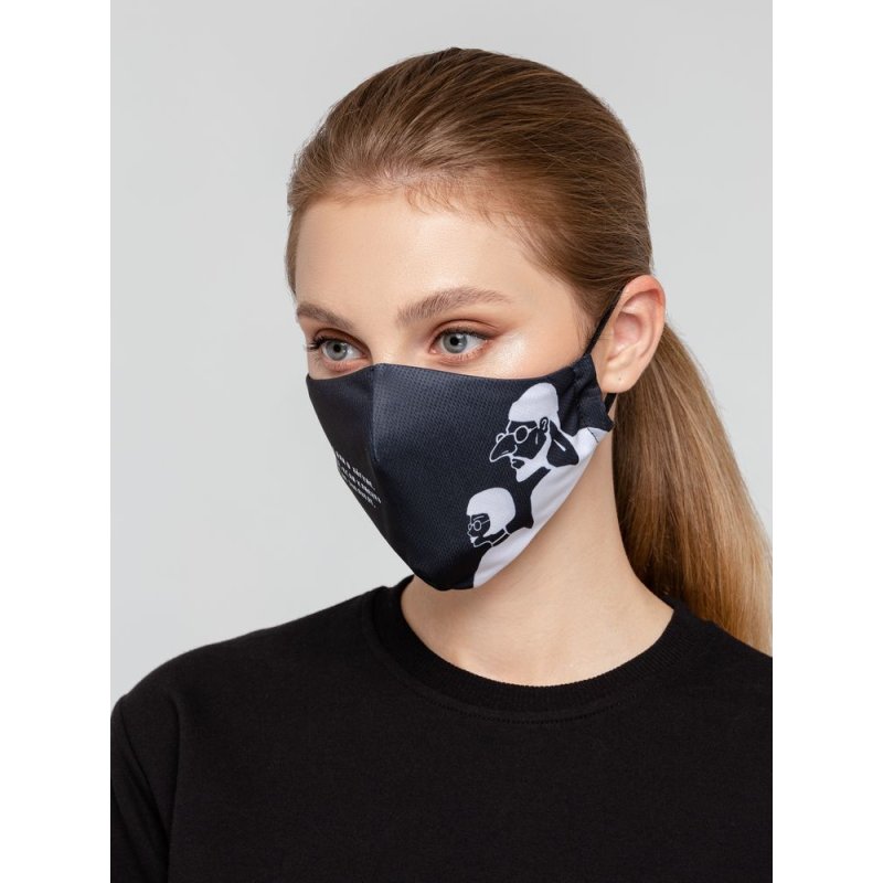 Многоразовая маска из дышащей ложной сетки с ярким принтом с гигиенической хлопковой подкладкой и заушниками-резинками.