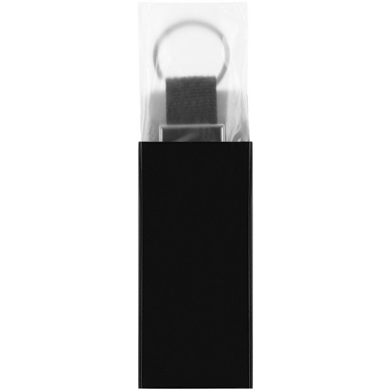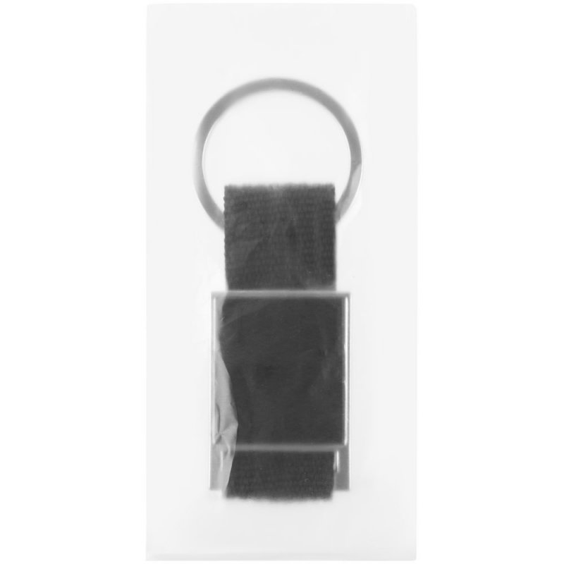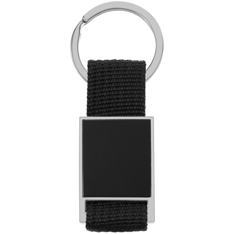 Элегантный металлический брелок с тканевой вставкой. Логотип можно нанести на гелиевой пластине посредине.