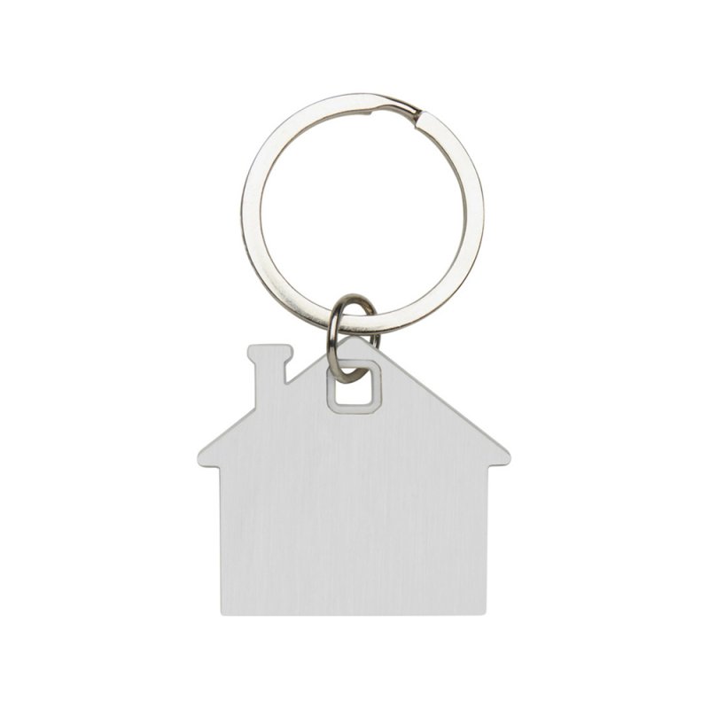Брелок для ключей в форме домика с цветной вставкой из пластика между 2-мя серебристыми пластинами из стали.