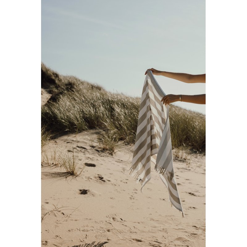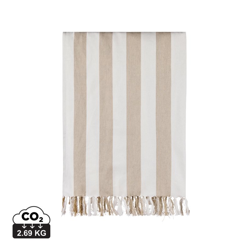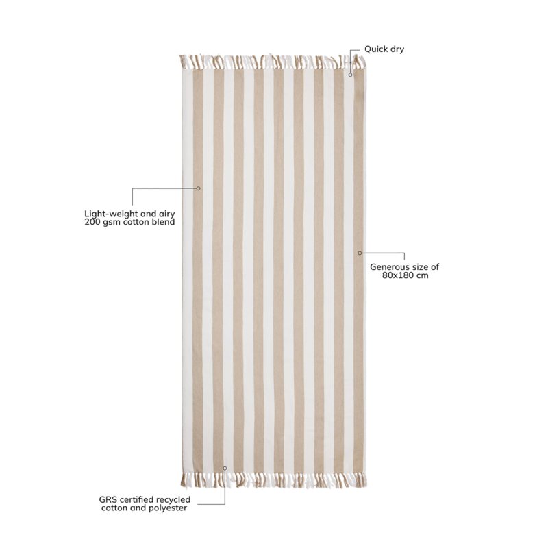 Стильное полотенце в полоску VINGA Ornos станет роскошным дополнением на вашем отдыхе. Легкий и воздушный материал объединил в себе мягкость хлопка и простоту полиэстера — благодаря нему полотенце быстро сохнет. Размер 80x180 см идеально подходит для пляжа или бассейна. Общее содержание вторсырья: 68% переработанного хлопка и 29% переработанного полиэстера, сертифицированных GRS. Сертификация GRS гарантирует, что вся цепочка поставок переработанных материалов проверена и подтверждена. Плотность материала 200 г/м².