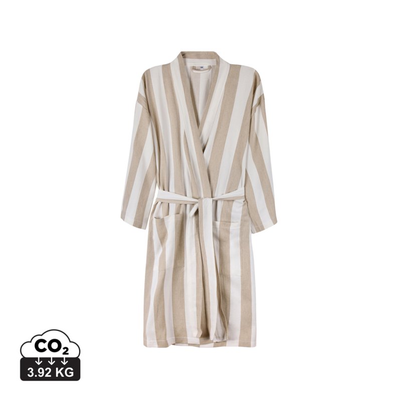 Стильный халат VINGA Ornos просто создан для пляжа и отдыха. Легкий и воздушный материал объединил в себе мягкость хлопка и простоту полиэстера — благодаря нему полотенце быстро сохнет. Изделие выполнено в классическом стиле с двухцветными полосками. Для максимального удобства предусмотрены карманы, рукава 3/4 и пояс на талии. Сертификация GRS (Global Recycled Standard) гарантирует, что вся цепочка поставок переработанных материалов проверена и подтверждена. Содержание вторсырья от общего веса изделия: 69% переработанный хлопок и 29% переработанный полиэстер. Плотность ткани: 200 г/м².