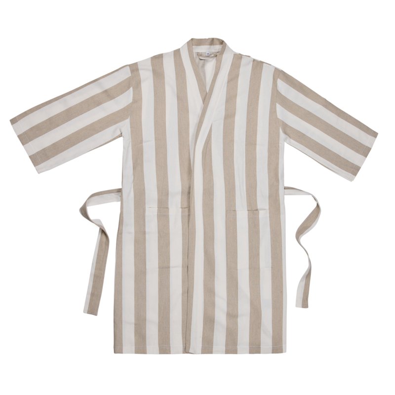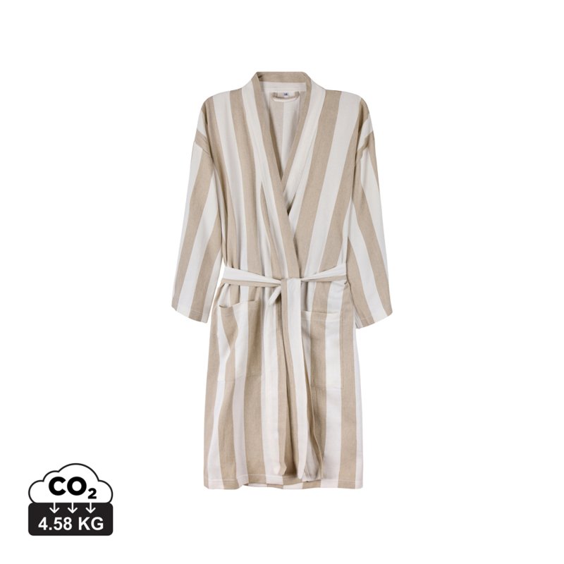 Стильный халат VINGA Ornos просто создан для пляжа и отдыха. Легкий и воздушный материал объединил в себе мягкость хлопка и простоту полиэстера — благодаря нему полотенце быстро сохнет. Изделие выполнено в классическом стиле с двухцветными полосками. Для максимального удобства предусмотрены карманы, рукава 3/4 и пояс на талии. Сертификация GRS (Global Recycled Standard) гарантирует, что вся цепочка поставок переработанных материалов проверена и подтверждена. Содержание вторсырья от общего веса изделия: 69% переработанный хлопок и 29% переработанный полиэстер. Плотность ткани: 200 г/м².