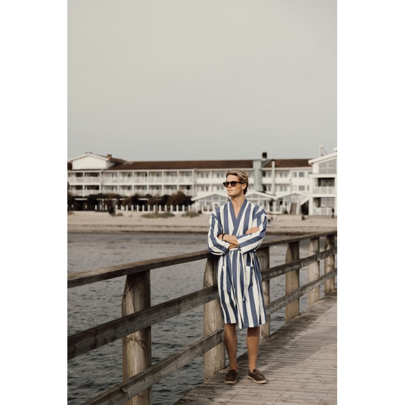 Стильный халат VINGA Ornos просто создан для пляжа и отдыха. Легкий и воздушный материал объединил в себе мягкость хлопка и простоту полиэстера — благодаря нему полотенце быстро сохнет. Изделие выполнено в классическом стиле с двухцветными полосками. Для максимального удобства предусмотрены карманы, рукава 3/4 и пояс на талии. Сертификация GRS (Global Recycled Standard) гарантирует, что вся цепочка поставок переработанных материалов проверена и подтверждена. Содержание вторсырья от общего веса изделия: 69% переработанный хлопок и 29% переработанный полиэстер. Плотность ткани: 200 г/м².
