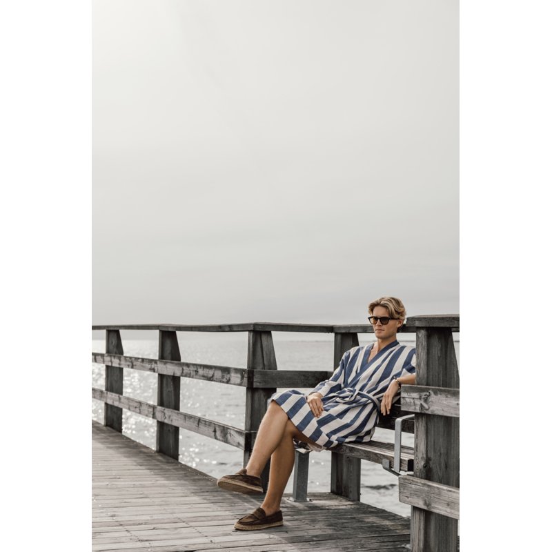 Стильный халат VINGA Ornos просто создан для пляжа и отдыха. Легкий и воздушный материал объединил в себе мягкость хлопка и простоту полиэстера — благодаря нему полотенце быстро сохнет. Изделие выполнено в классическом стиле с двухцветными полосками. Для максимального удобства предусмотрены карманы, рукава 3/4 и пояс на талии. Сертификация GRS (Global Recycled Standard) гарантирует, что вся цепочка поставок переработанных материалов проверена и подтверждена. Содержание вторсырья от общего веса изделия: 69% переработанный хлопок и 29% переработанный полиэстер. Плотность ткани: 200 г/м².