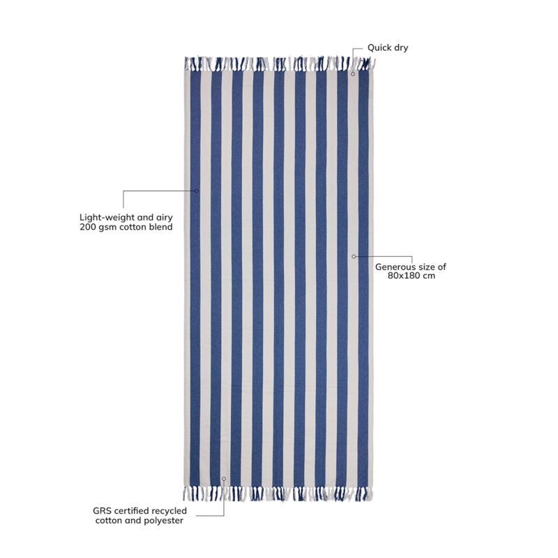 Стильное полотенце в полоску VINGA Ornos станет роскошным дополнением на вашем отдыхе. Легкий и воздушный материал объединил в себе мягкость хлопка и простоту полиэстера — благодаря нему полотенце быстро сохнет. Размер 80x180 см идеально подходит для пляжа или бассейна. Общее содержание вторсырья: 68% переработанного хлопка и 29% переработанного полиэстера, сертифицированных GRS. Сертификация GRS гарантирует, что вся цепочка поставок переработанных материалов проверена и подтверждена. Плотность материала 200 г/м².