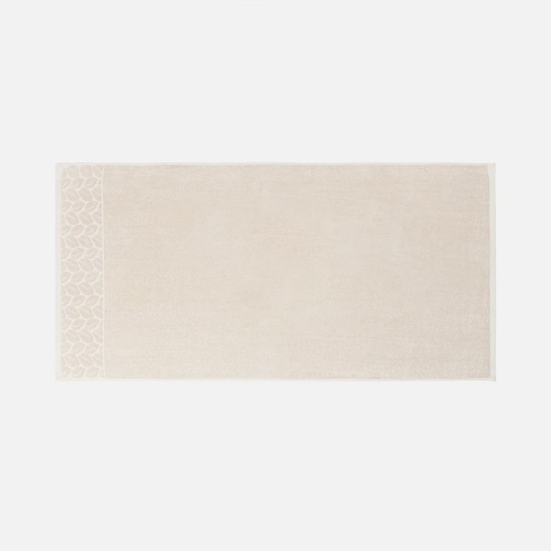 Светлые оттенки в сочетании с широким бордюром с рельефным растительным узором придают полотенцу элегантный и свежий вид.