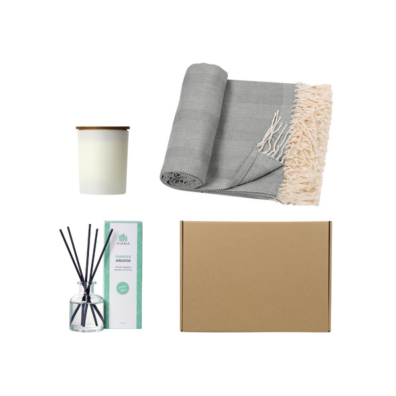 - Материал товара:плед - 100% хлопок, аромат для дома - стекло, фибровые палочки, свеча - воск, стекло, дерево, коробка - картон
