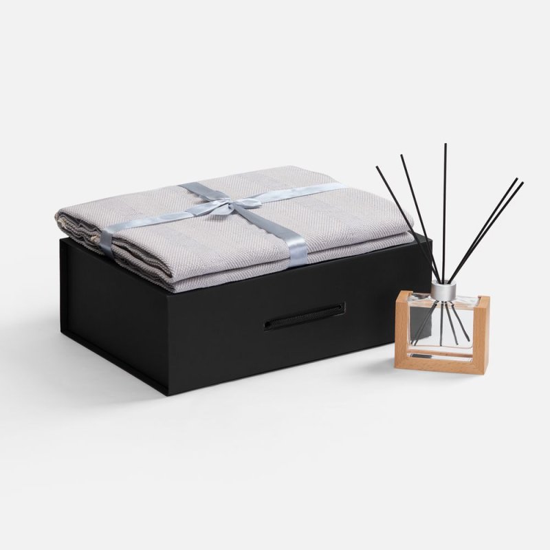 - Материал:флакон - стекло, палочки из файбера; подставка для флакона - дерево; плед - хлопок 95%, полиэстер 5%, плотность 300 г/м²; коробка - переплетный картон, бумага Malmero