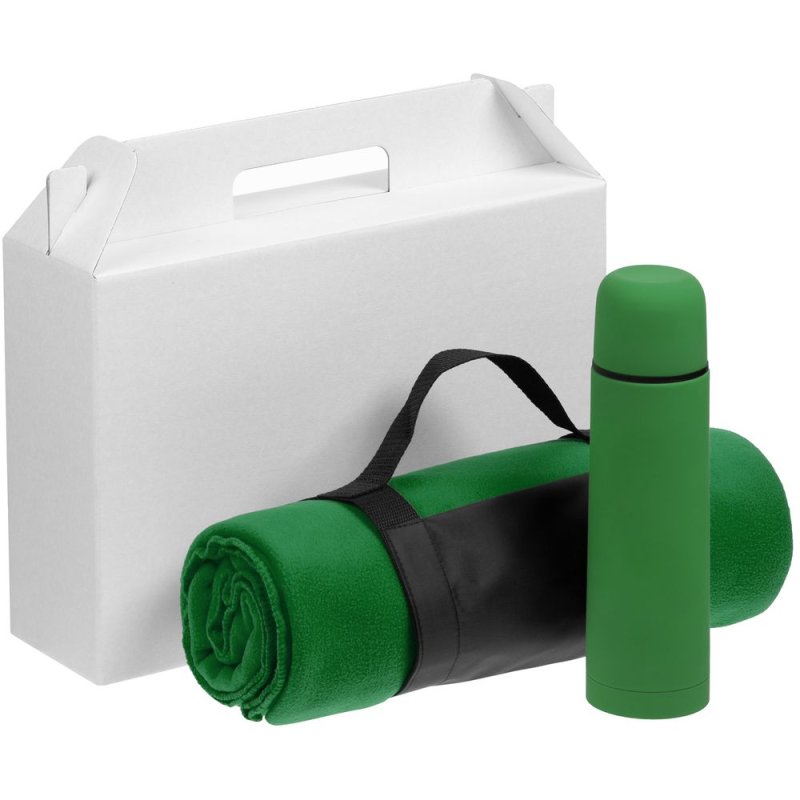 - Материал:плед - флис, плотность 180 г/м²; термос - нержавеющая сталь, 304 внутри, 201 снаружи, пластик, покрытие софт-тач; коробка - микрогофрокартон
