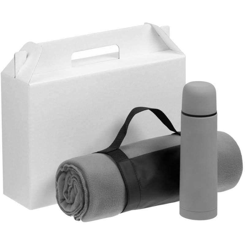 - Материал:плед - флис, плотность 180 г/м²; термос - нержавеющая сталь, 304 внутри, 201 снаружи, пластик, покрытие софт-тач; коробка - микрогофрокартон