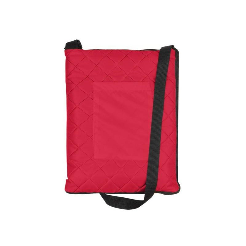 Двухсторонний плед с водоотталкивающим покрытием с одной стороны и мягким флисом с другой. Складывается в сумку на плечо и фиксируется с помощью молнии. В собранном виде имеет регулируемый по длине ремень для переноски и наружный карман для мелочей.