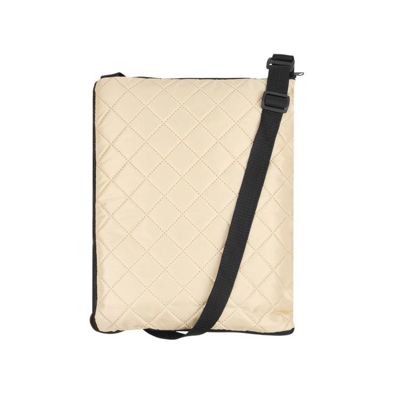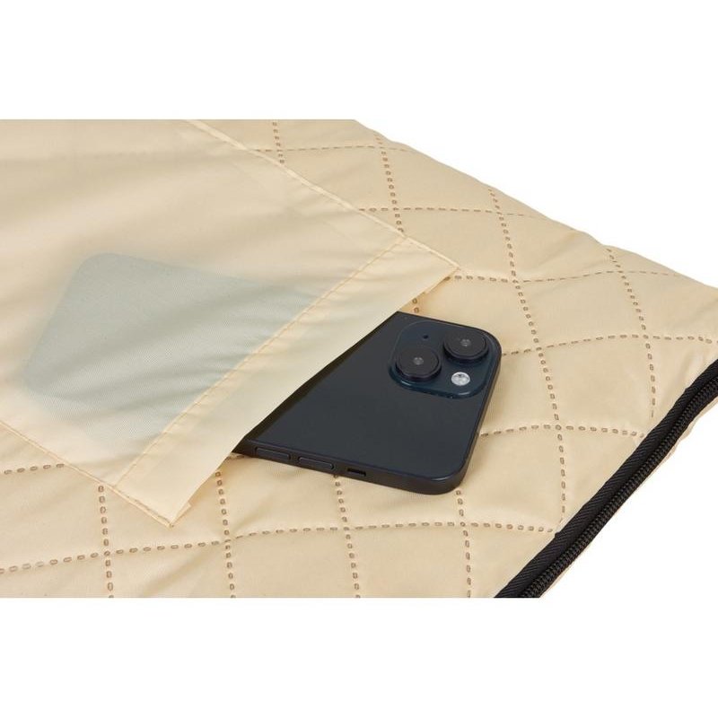 Двухсторонний плед с водоотталкивающим покрытием с одной стороны и мягким флисом с другой. Складывается в сумку на плечо и фиксируется с помощью молнии. В собранном виде имеет регулируемый по длине ремень для переноски и наружный карман для мелочей.