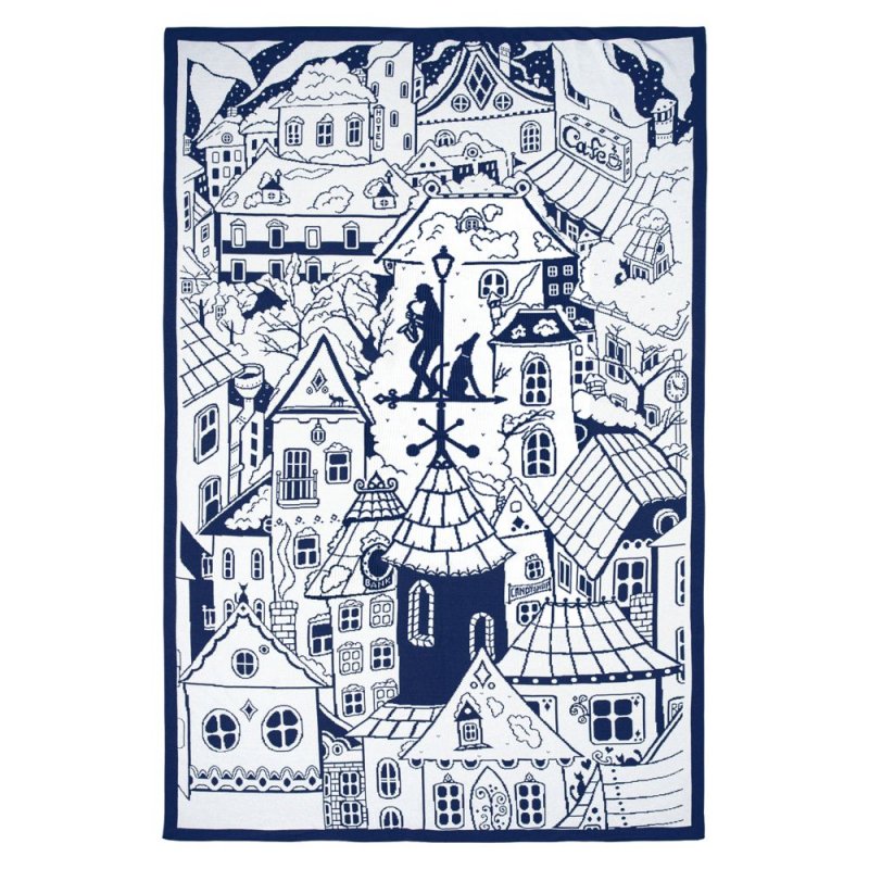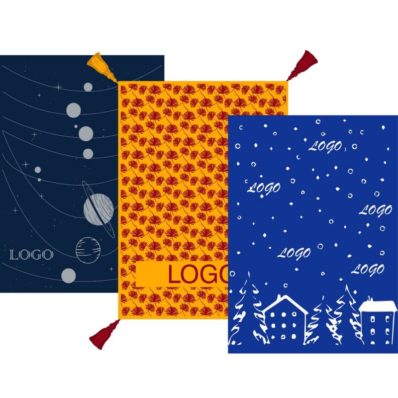 Плед с вывязанным логотипом и индивидуальным рисунком в фирменной цветовой гамме.