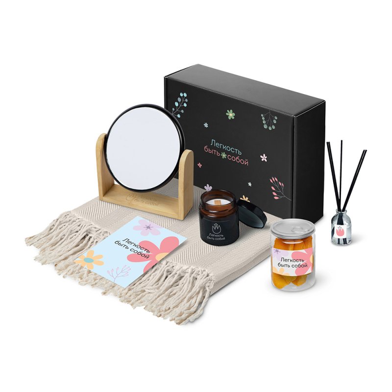 Re:f. Shelter — о чувстве защищённости и тихом пространстве для себя. Укутайтесь в плед, зажгите свечу, пусть диффузор наполнит комнату мягким ароматом — так создаётся настроение покоя и уюта. Зеркало становится маленькой деталью внимания к себе, а сушёное манго добавляет солнечную, тёплую нотку, напоминая о простых радостях. Этот набор — про личное укрытие, где можно выдохнуть, замедлиться и просто побыть в моменте.