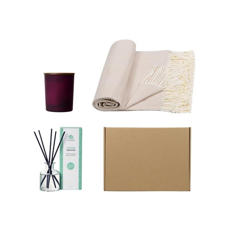 - Материал товара:плед - 100% хлопок, аромат для дома - стекло, фибровые палочки, свеча - воск, стекло, дерево, коробка - картон