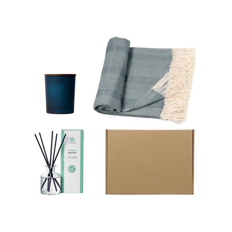 - Материал товара:плед - 100% хлопок, аромат для дома - стекло, фибровые палочки, свеча - воск, стекло, дерево, коробка - картон