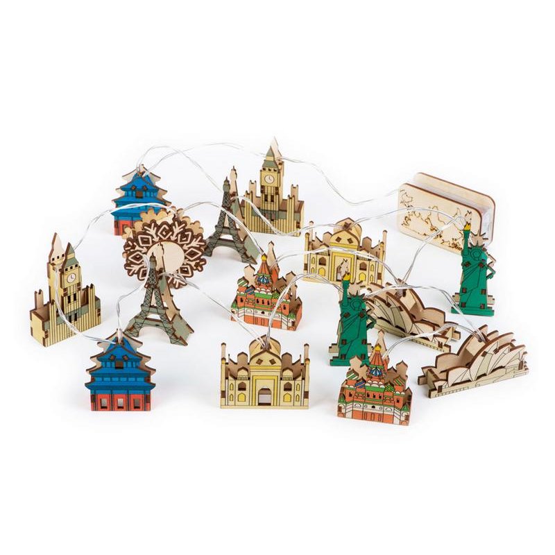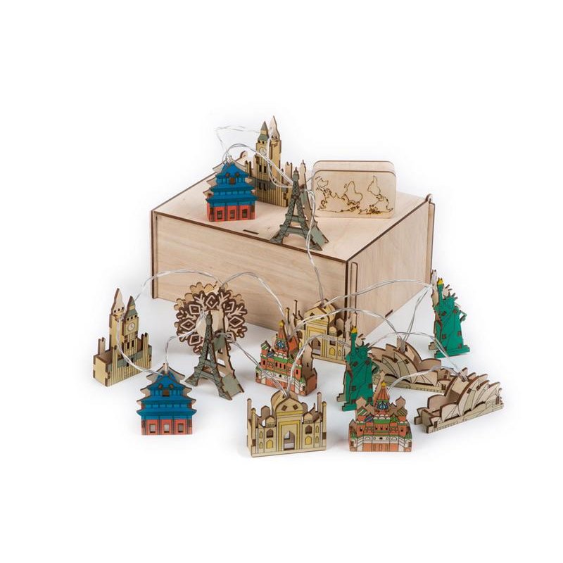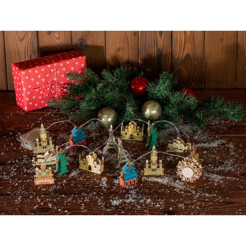 Новогодняя ёлочная гирлянда постоянного свечения с цветными фигурками достопримечательностей из натуральной березовой фанеры сделает процесс украшения ёлки или дома не только увлекательным, но и познавательным!