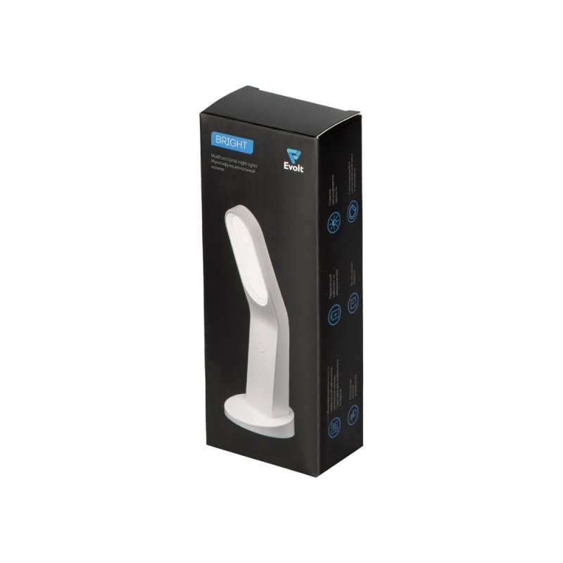 Мультифункциональный ночник Bright от Evolt можно использовать как настольную лампу на подставке, настенный светильник или даже в качестве держателя для мобильного телефона.